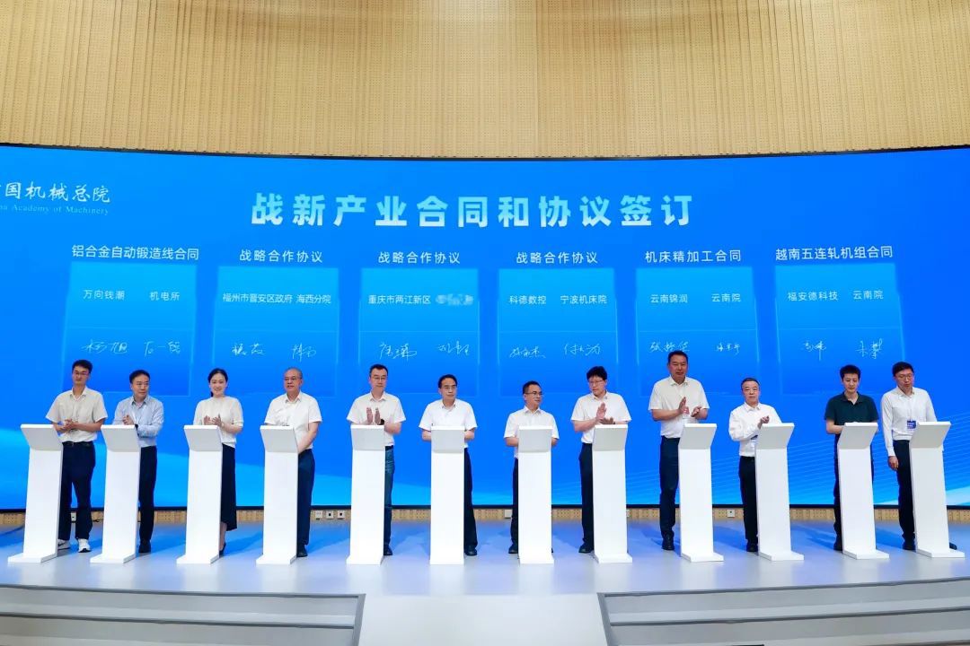 會上,中國機械總院集團及所屬公司沈鑄所、北自所、機電所、機科股份、基礎院、海西分院、寧波機床院、云南院等單位分別與中國商飛上飛公司、皖維高新、中國航發南方、中國航發中傳、東方數科、中物院八所、萬向錢潮、科德數控、云南錦潤、福州市晉安區政府、重慶兩江新區等12家企業和地方政府簽署戰新產業合同及協議。