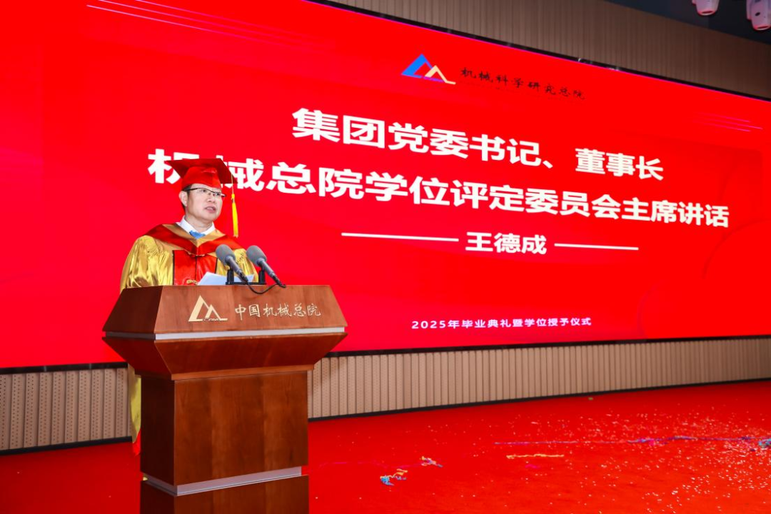 機(jī)械總院學(xué)位評(píng)定委員會(huì)主席、集團(tuán)黨委書記、董事長王德成,集團(tuán)黨委副書記、總經(jīng)理孟祥宇,集團(tuán)黨委副書記、董事李玉鑫,集團(tuán)黨委委員、副總經(jīng)理王宇,機(jī)械總院學(xué)位評(píng)定委員會(huì)副主席、集團(tuán)副總經(jīng)理李愛國,集團(tuán)副總經(jīng)理姜超出席典禮,機(jī)械總院學(xué)位評(píng)定委員會(huì)委員、京內(nèi)外各二級(jí)單位領(lǐng)導(dǎo)、導(dǎo)師代表、研究生管理部門負(fù)責(zé)人、2025屆畢業(yè)生及家屬共計(jì)190余人齊聚一堂,共同見證這一重要時(shí)刻。典禮由機(jī)械總院學(xué)位評(píng)定委員會(huì)秘書長、研究生院副院長邊翊主持。