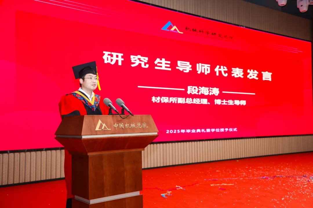 材保所副總經(jīng)理、博士生導(dǎo)師段海濤作為導(dǎo)師代表發(fā)言,為全體畢業(yè)生送上囑托和期望。他希望同學(xué)們樹立“大志向”、堅(jiān)守“大擔(dān)當(dāng)”、秉持“大情懷”,用真才實(shí)學(xué)鐫刻屬于自己的璀璨印記。